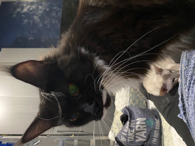 Maine Coons are wonderful companions. They love to be where you are and do what you are doing. The boys are generally 12-18 pounds with the girls being a bit smaller at 8-12 pounds. They mostly get along with everyone (including dogs if properly introduced) and are great with kids. Orientals are very people oriented and are frequently very in your face, but they also like to have other feline companionship and are known to do slinkie piles in the nearest cuddle bed.